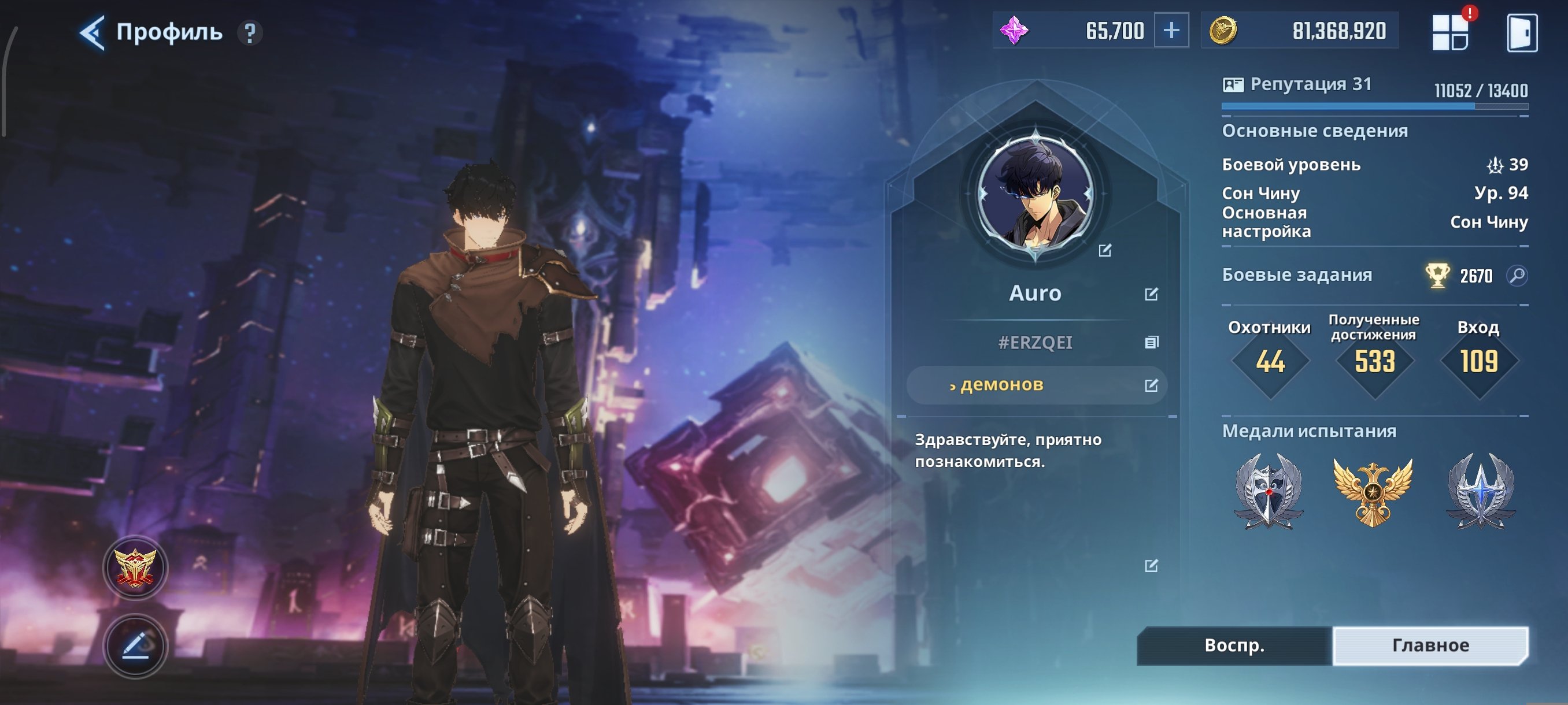 Краткое описание: 💲Продаю аккаунт/Solo leveling:Arise/Selling account💲Подробное описание: 🔥910 тыс. общей боеспособности, но можно сделать больше, если вкачать артефакты и оружки персов, ядра, тени! 94-й уровень, 41/45 охотников, 85/120 оружия. Много оружек Джинву на 100 для разных билдов и т. д. И много вкаченных персов на 94-й уровень.🔥