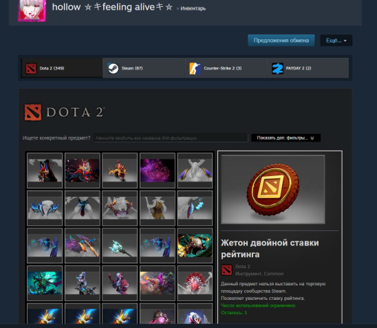 Подробное описание: 🟥🟥🟥на аккаунте много игр🟥🟥🟥, такие как: 🟥ваша мать🟥, beamng drive🟥, dying light (1,2)🟥, GTA V🟥, Red dead Redemption 2🟥, wallpaper engine🟥, R.E.P.O🟥, pay day 2🟥, на аккаунте присутствует 19 лвл стима🟥, и много всего для украшения профиля стим🟥🟥🟥, в доте 2 инвентарь🟥: плюшевый пудж🟥, аркана на цм🟥, на рубика аркана🟥, и еще много разных и красивых скинов🟥🟥🟥, MMR 3800🟥🟥🟥