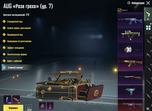 💎M416 «Охваченный приливом» — 8 уровень🔴💎М416 «Шут» — 7 уровень🔴💎M762 «Сияющая муза» — 7 уровень🔴💎АКМ «Пустынная окаменелость» — 7 уровень🔴💎AUG «Роза греха» — 7 уровень🔴💎SCARL «Сияющая длань» — 7 уровень🔴