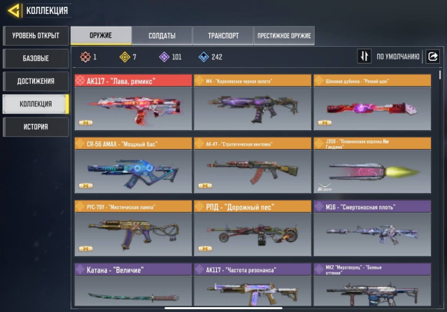 🍊 ОРУЖИЕ: 1 МИФИК; 7 ЛЕГА; 101 ЭПИК🟪, 242 РЕДКИЙ🟦