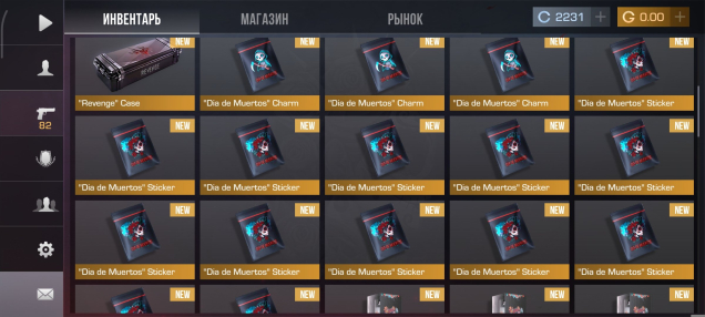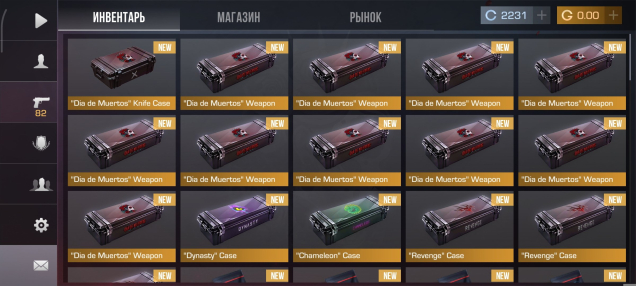 Кейсы: «Dia de Muertos» Knife Case (1) «Dia de Muertos» Weapon Case (10), Dynasty (1), Chameleon (1) Revenge (3) и другие.