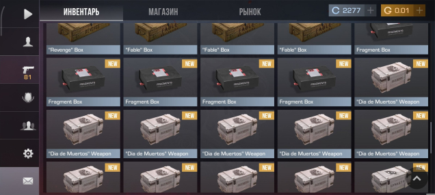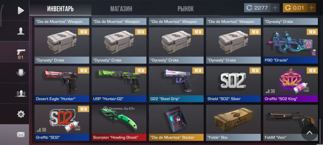 Кейсы: «Dia de Muertos» Knife Case (1) «Dia de Muertos» Weapon Case (10), Dynasty (1), Chameleon (2), Fable (1) Revenge (1) и другие.