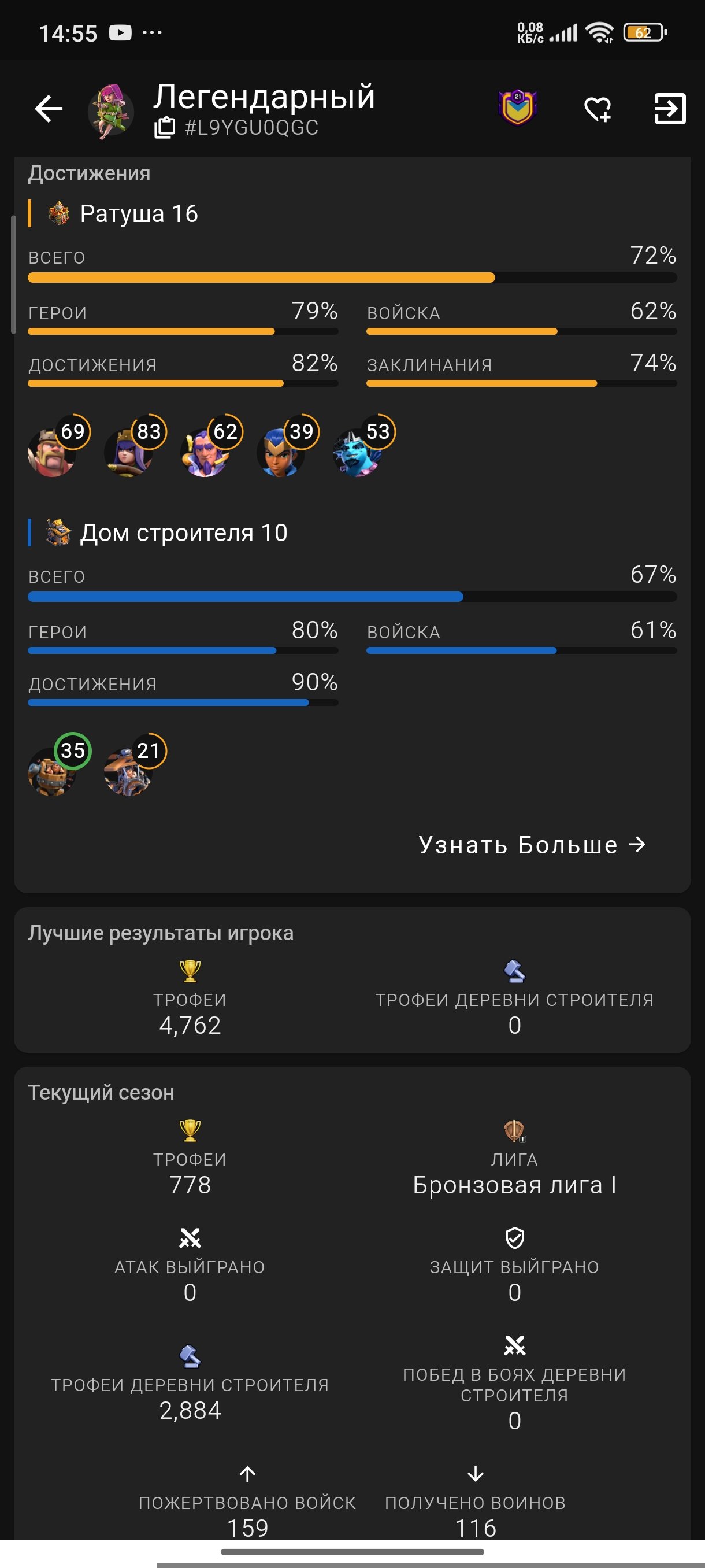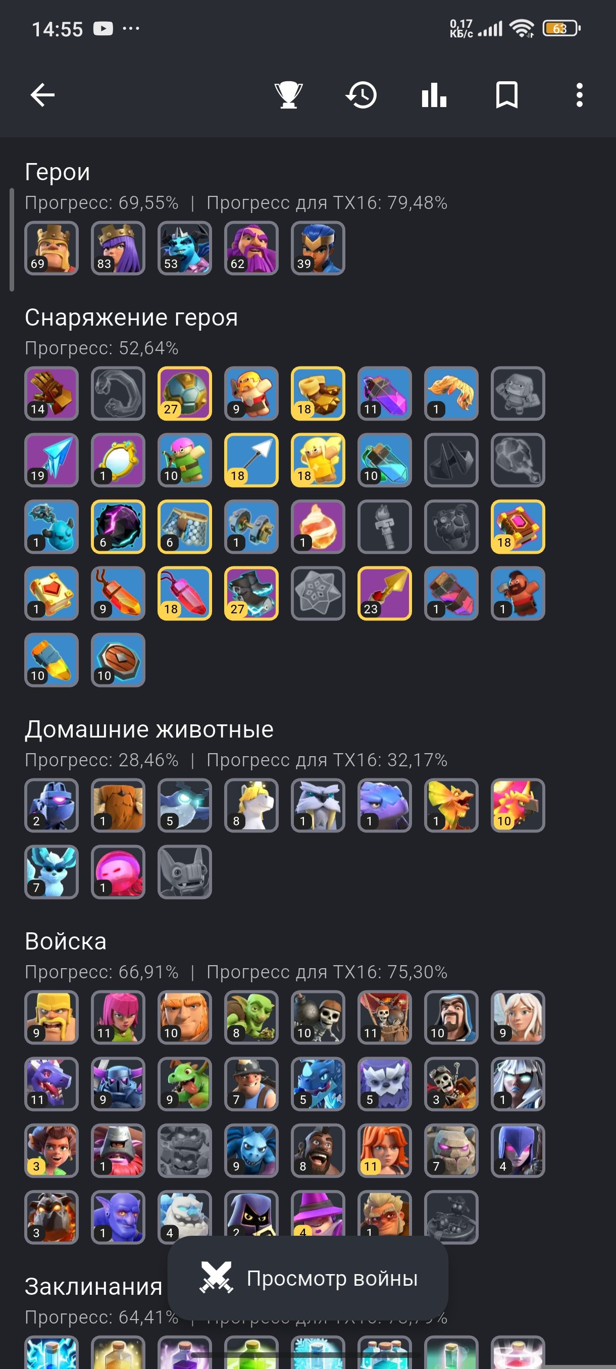 Уровень Ратуши: 16Краткое описание: Ёлки 21,22,23,24года🎄 【𝟏6 ТХ ❰🌟ФУЛЛ 72%🌟❱ 💯【 𝟏88 LVL] 🏆【 ГЕРОИ — 69/83/53/62/36]❗фулл снаряги чек