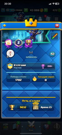 🀄️Быстрая ВЫДАЧА🀄️🏆9032🏆🟣6 EVO🟣🌟36 ЭМОДЖИ🌟‼️ПОДРОБНЕЕ В ОПИСАНИИ‼️👑С ПОЧТОЙ👑, 23 арена, 42 уровень, 9032 кубков, 121 карт, Нет