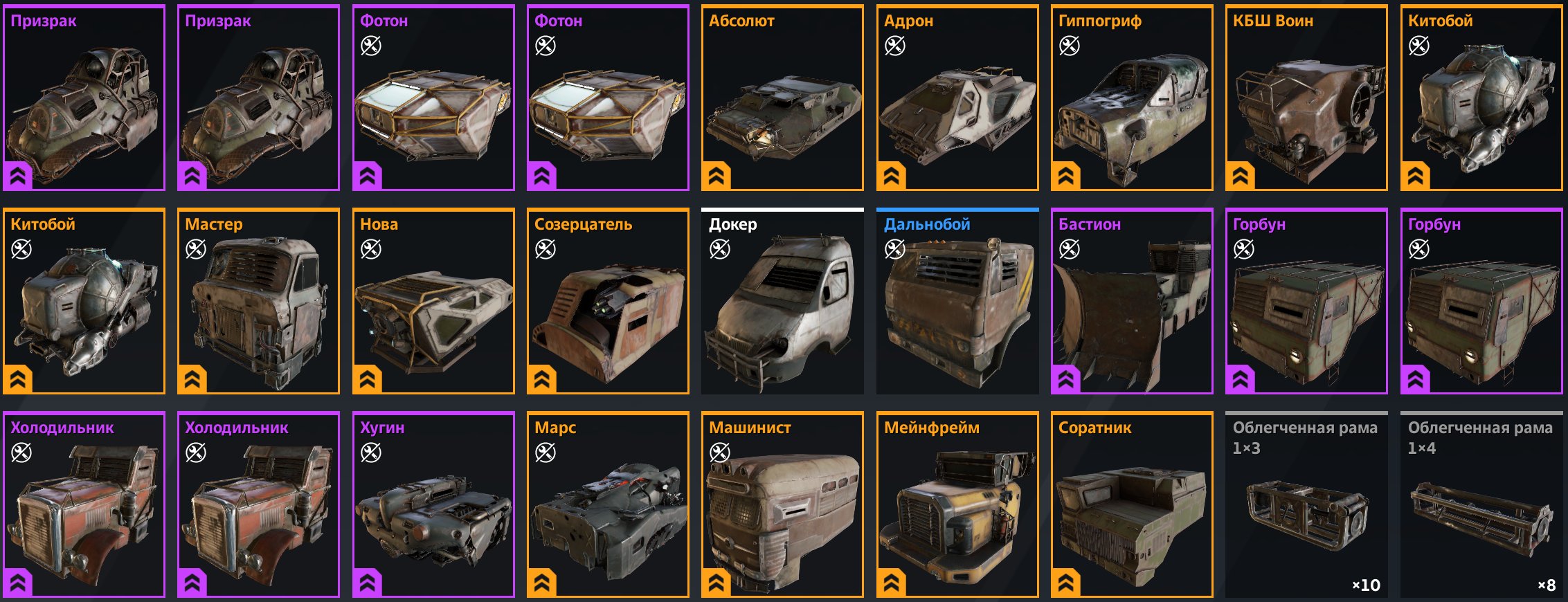 + ходовой на складе лежит побольше, чем на скриншоте из-за ограничения по количеству фото, лежат еще: улучшенные бигфуты, виджеты, увабаки и затворники.
