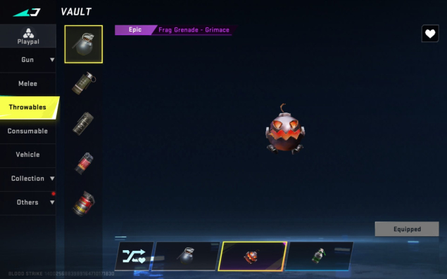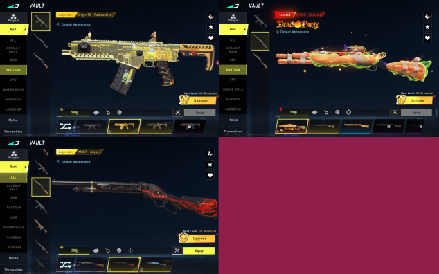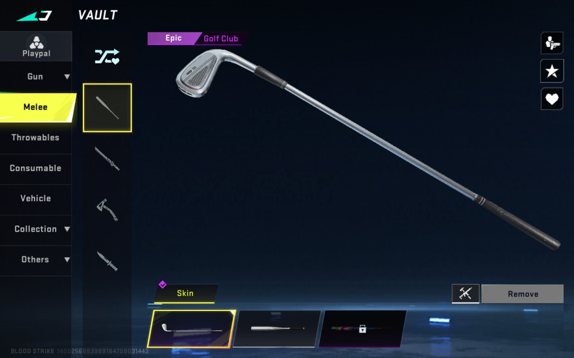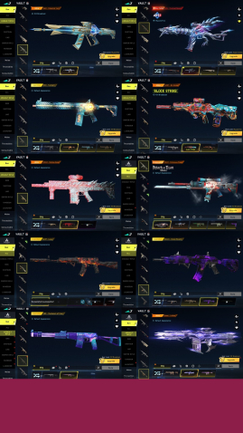 M1887 — Abyss Kala — Tiger✅ M700 — Ethereal Blue✅ SVD — Hellbound✅ Kar98k — Glory✅ M82 — Nightmare Entanglement ✅ M4A1 — Colossus Titan✅ KAG-6 — Violet Wraith✅ Spear — Iridian ✅ VSS — Pendulum of Fate✅ AK47 — Lava✅ Scar — Molten Core✅ AR97 — Bit Strike✅ Fal — Evolved Draco✅ Galil — Celestial vein✅ MCX — Twilight✅ INP-9 — Molten Core✅ Vector — Violet Wraith✅ URB — Blood Vengeance✅ UMP45 — Pendulum of Fate✅ Lightblade — Dark Force✅ Golf Club ✅ Frag Grenade — Grimace ✅