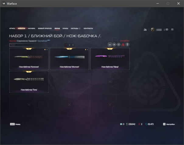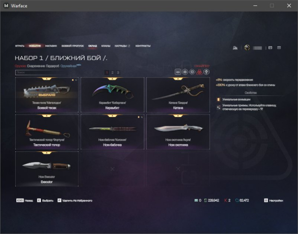 ✔️ Ножи: Нож-бабочка «Молния», Нож-бабочка «Колония», Нож-бабочка «Эфир», Нож-бабочка «Топь», Катана «Бездна», Тактический топор «Фортуна», Нож охотника «Акула», Боевой тесак «Тундра», Тесак-пила «Мегалодон»