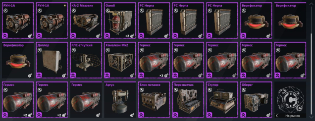 🟣 Фиолетовое оружие: 20 шт. | 🟣 Фиолетовые кабины: 10 шт. | 🟣 Фиолетовая аппаратура: 41 шт. | 🟣 Фиолетовая ходовая: 54 шт.