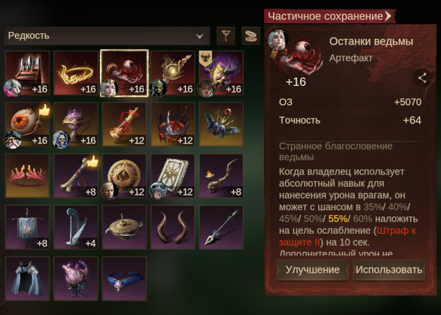 Миф. артефакты — ОСТАНКИ ВЕДЬМЫ — имба арт, дающий массовый разлом брони 2 уровня, Посох привратника и другие (см. скрины) .