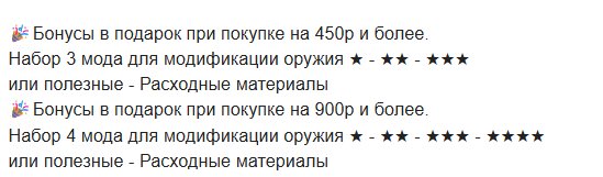 Если Вы видите у меня дублирование или похожие предложения, но с разными ценами — не беспокойтесь. Это означает, что один и тот же типовой товар (валюта, предметы, услуги) предлагают несколько разных игроков, которым он достаётся разными усилиями (кто-то фармит валюту/предметы вручную, кто-то владеет ботофермами и т.п. случаи).