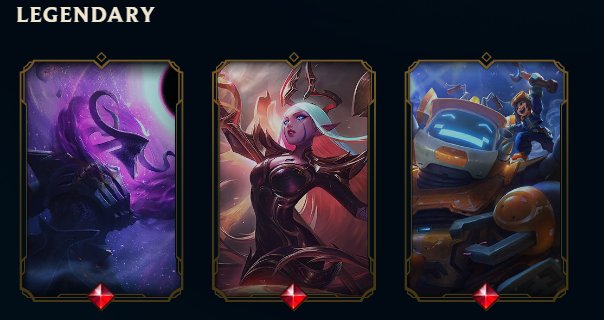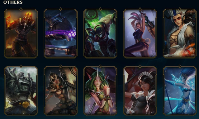 Прочие Скины: Ассасин Мастер Йи, Фиора из королевской гвардии, Костяной дракон Шивана, Боевой зайчик Ривен, Джаксимус, Дриада Сорака, Хранительница Сивир, Элиза на маскараде Черной Розы, Имперский Ксин Жао, Британский Фиддлстикс, Усиленный Синджед, Чо'Гат юрского периода, Ледяная королева Жанна, Бум-бум Блицкранк, Апокалиптический Брэнд, Горничная Нидали, Традиционный Трандл, Защитница Леона, Первобытный Удир, Riot Тристана, Королева Эш, Вершительница Кейл