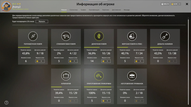 Добыча наживок 43,5%; Приготовление прикормки 100%; Кулинария 39,4%;