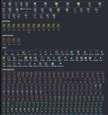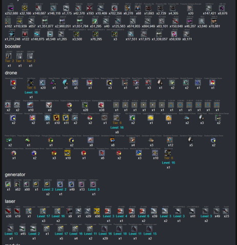 | 2m x2, 1m x3, 1m x4, 80k rsb, 1m sab, 6k EMP, 29k ACM, | 2000 Diametrion, 1200 IAC, 700 ABR, 1070 I_Oil, 3k Rinusk, 5k Trace, 3.8k Aurus, 1.3k Schizm, 1.5k Scrap,