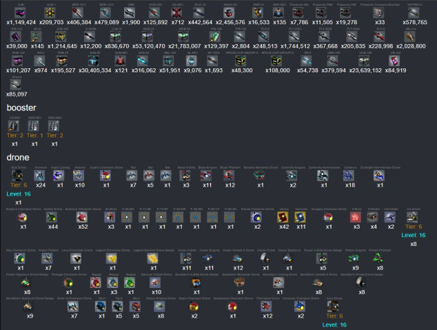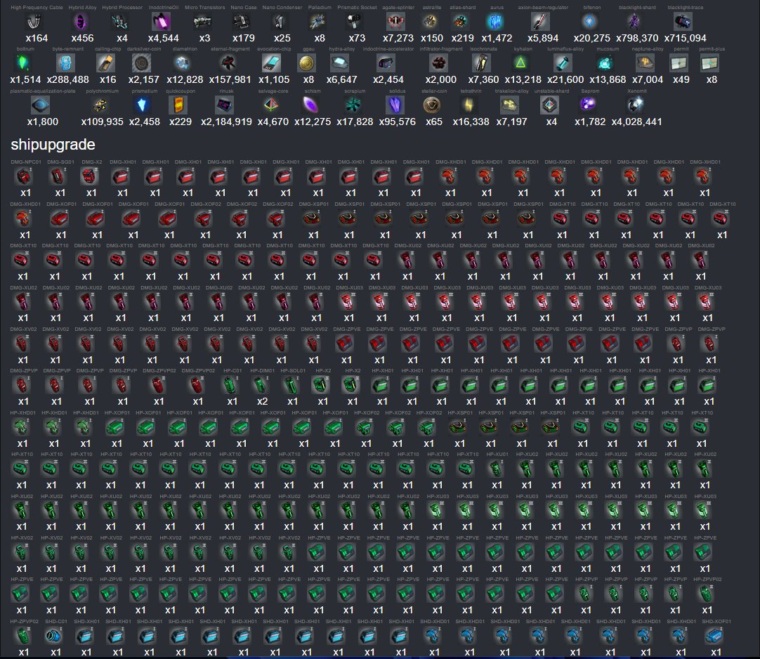 | 12,8k Diametrion, 2450 IAC, 5800 ABR, 4500 I_Oil, 2,1m Rinusk, 715k Trace, 1k Aurus, 12k Schizm, 17800 Scrap, 157 000 Eternal frag