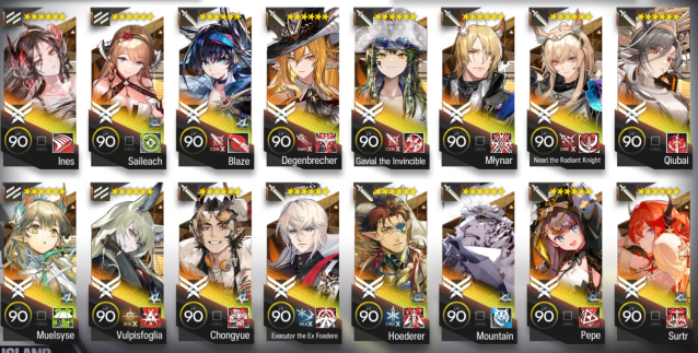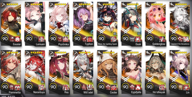 Global. 120 LvL, 97,4% всех операторов, все лимитные персонажи. 124 Originium и 63к Orundum.
