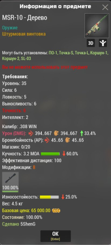 Сервер: RU-4Краткое описание: (МСР10) MSR-10 -дерево м8 (394-667) 33.4% урон -60.0 кучность -25 износ (все сервера)