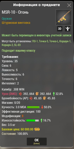 Сервер: USA-2Краткое описание: MSR-10 — Огонь м8 (392-664) 32.8% урон -50 кучность +16.7 износ (все сервера)
