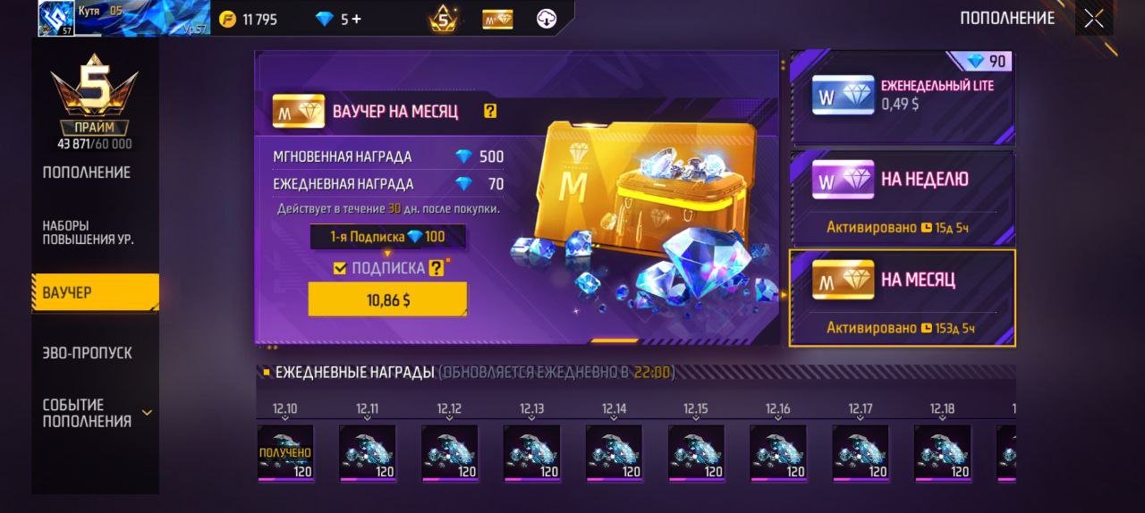 также в аккаунте куплены ваучеры месячные и недельные,