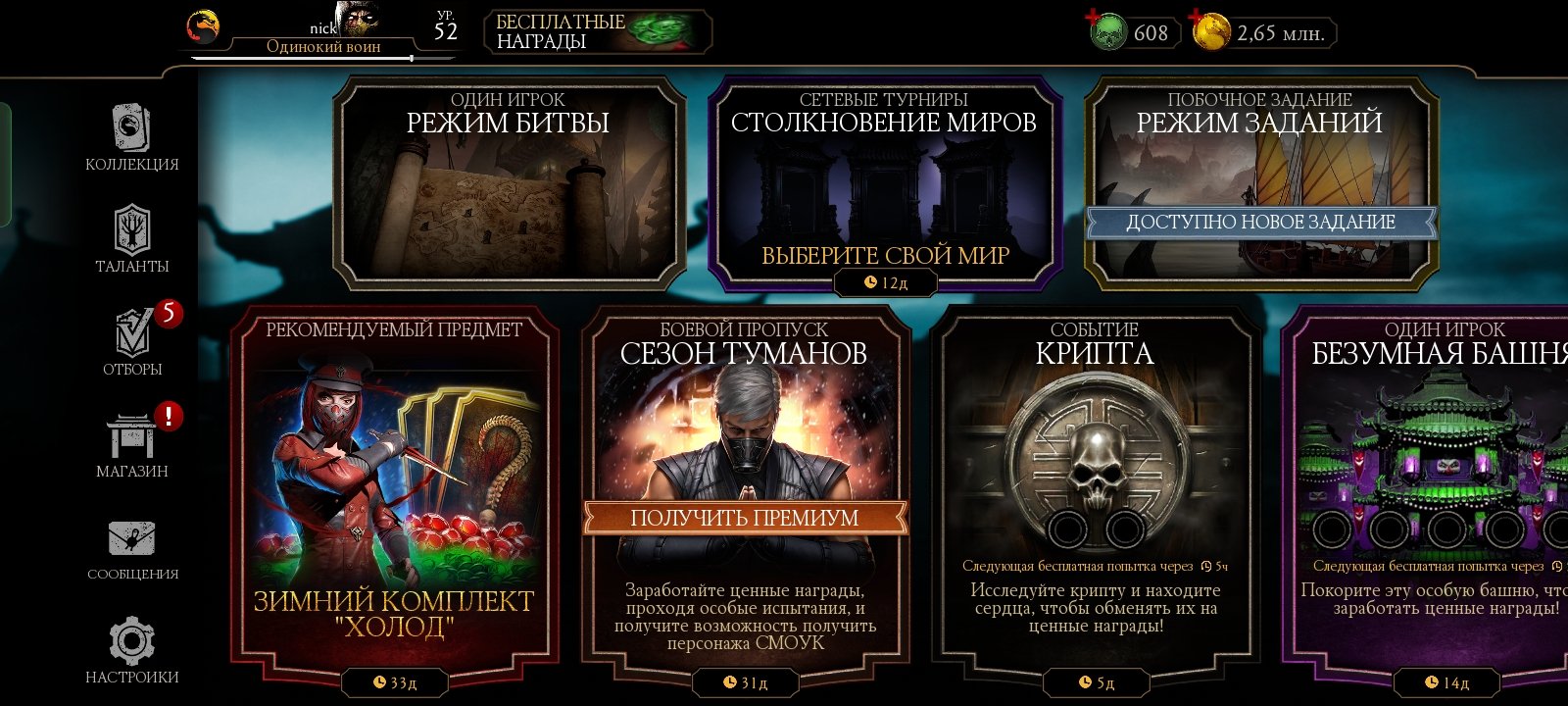52 уровень,63 алмазок (МК11 с Х слиянием), куча золотых персонажей с X слиянием, эпическое и редкое снаряжение(присутствует снаряжения из башен, есть парочку бруталити)