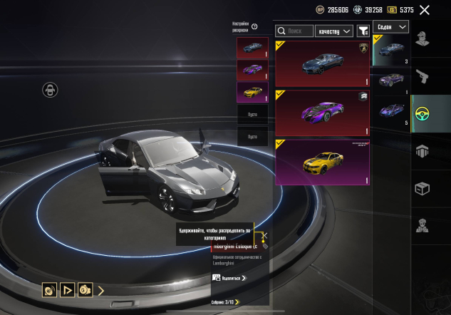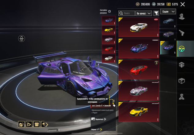 Lamborghini «Чёрный метал» → «Призрачная фиалка» → Bugatti «Сплав» → Pagani «Звонкая полночь» → Lamborghini «Багряная вспышка» → McLaren «Разовая фантазия» → McLaren «Вулканический жёлтый»