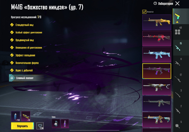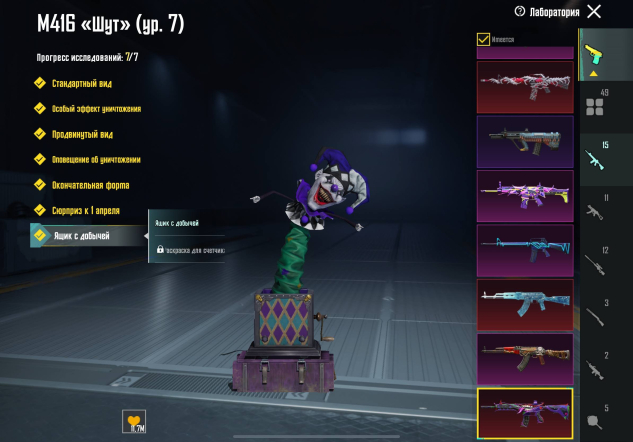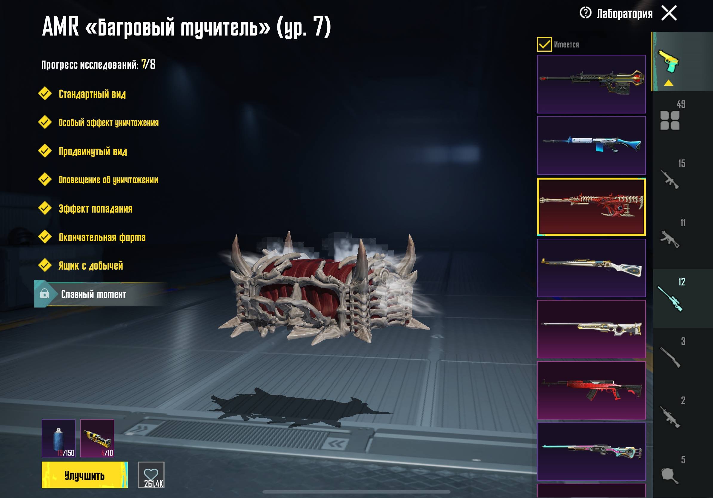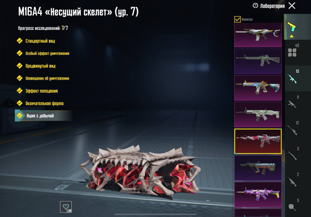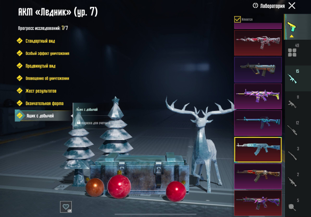 ❗️ SCAR-L «Мощный бас» — Уровень 5 → M416 «Императорская роскошь» — Уровень 4 → Томпсон «Карамельная трость» — Уровень 4 → UZI «Романтические моменты» — Уровень 4 → UMP45 «Радужное жало» — Уровень 4 → M24 «Убойная мелодия» — Уровень 4 → Kar98k «Милость луны» — Уровень 4 → AWM «Радужный дракон» — Уровень 4
