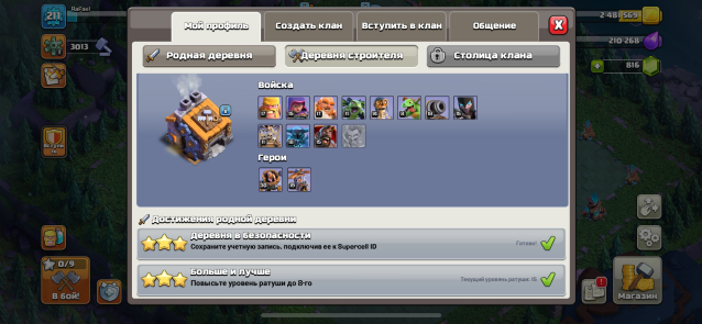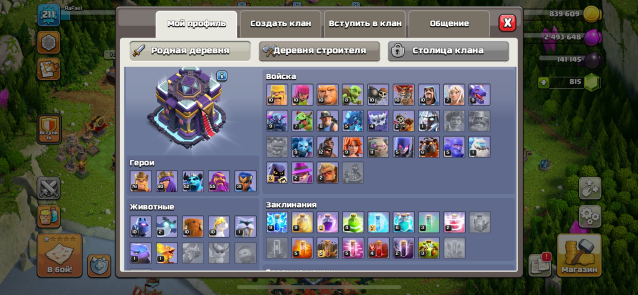 Уровень Ратуши: 15Краткое описание: 🟨🔥【 𝗧𝗛 𝟭𝟱】⚡ 𝟮𝟭𝟭 𝗟𝗩𝗟 ⚡💎 𝟴𝟬𝟬 ГЕМОВ 💎【ГЕРОИ — 𝟳𝟲/𝟴𝟬/𝟱𝟮/𝟱𝟱/𝟯𝟭】⚡ СКРИНЫ 🟨🔥