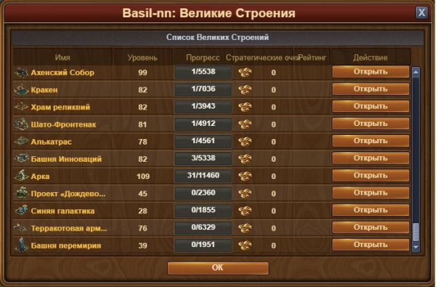ВС: Арка 109 ур. Арктическая Оранжерея 88 ур. Маяк 7 ур. Собор Святого Марка 11 ур. Ахен 99 ур. Кастель 95 ур. Шато 81 ур. Алькатрас 78 ур. Кракен 82 ур. Космодром 80 ур. Статуя Зевса 99 ур. Собор Святой Софии 90 ур. Храм реликвий 82 ур. Башня Инноваций 82 ур. Проект «Дождевой лес» 45 ур. Синяя Галактика 28 ур. Терракотовая армия 76 ур. Башня перемирия 39 ур.