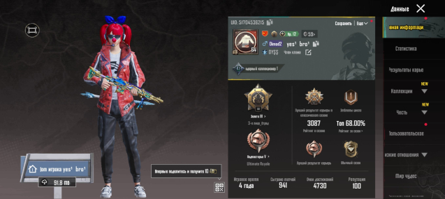 Подробное описание: Мумия, шлем лед.Мк позолота фулловая, нос клоуна, 4 купленных батл пасса шмотки в метро а также мк золото и 2 фулл 6 золото, машина с мифик фордж мг 3 с мифик фордж сайга ракета с мифик фордж