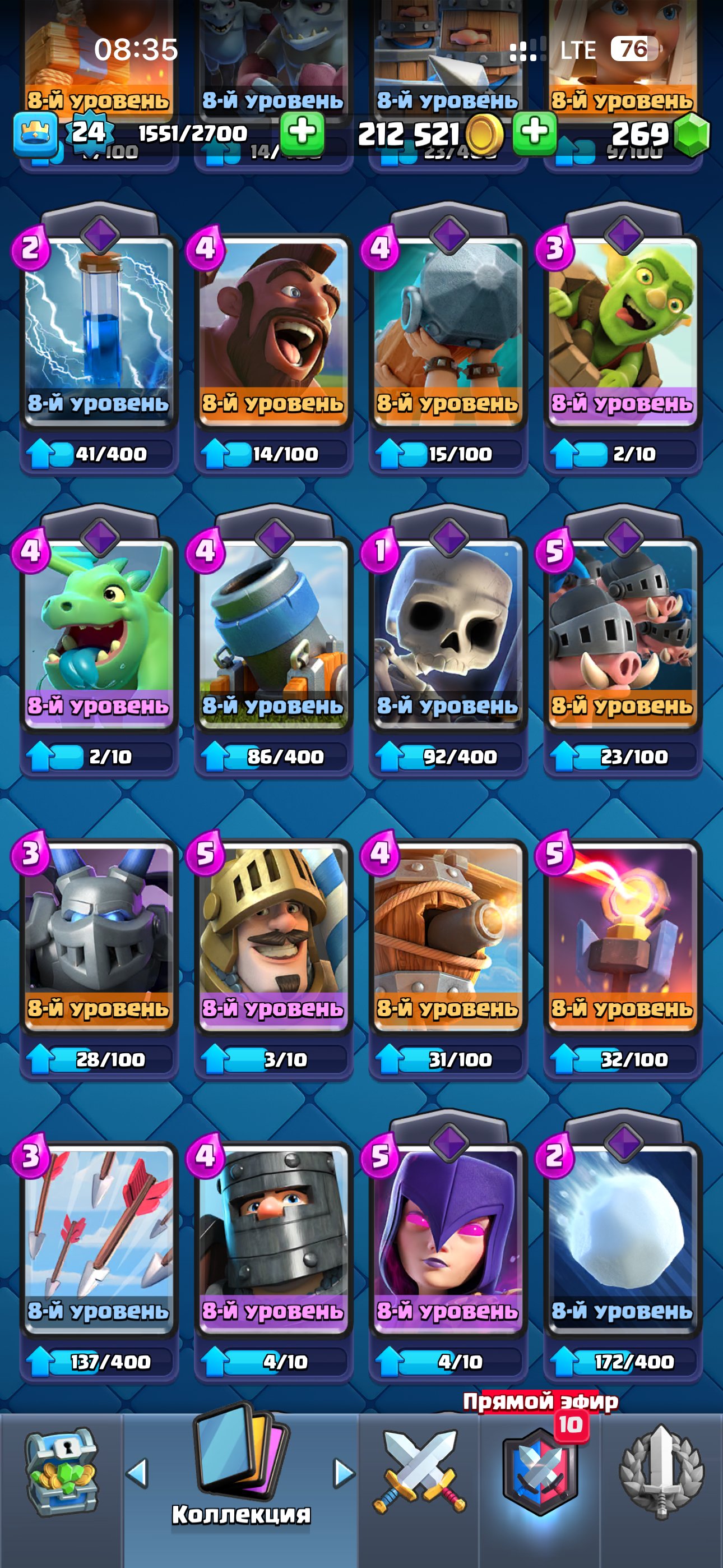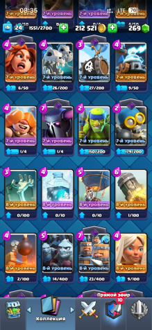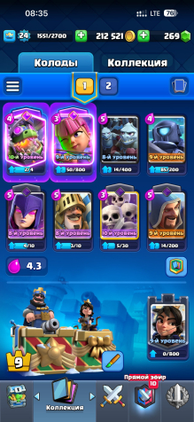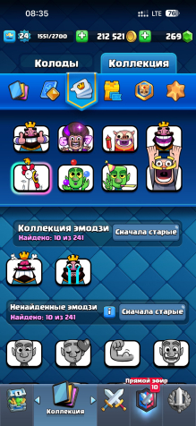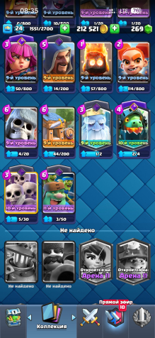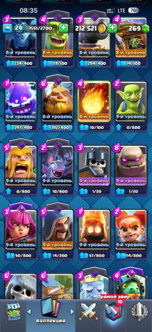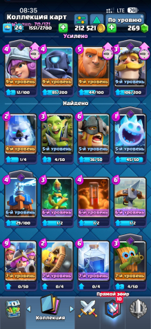 За время игры было открыто 70 карт, среди которых есть 2 легендарные и 19 эпических — это даёт широкий выбор колод под разные стили игры. Аккаунт находится на 10 арене, что позволяет участвовать в большинстве режимов и ивентов.
