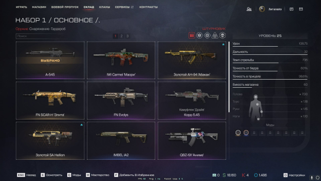 Шт: А-545, Золотой Абакан, FN Evloys, Fn-scar-H элита, Корд 5-45, Золотой SA Helion QBZ-191 Аниме, Ак-12, Золотой ПКМ-Зенит (Стиль Олег Климов, Штурмовик отряда «Фантом», Штурмовик отряда Горгона)
