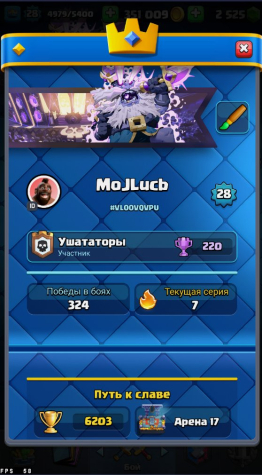 Краткое описание: 🎪CLASH ROYALE🎪|🏮17 АРЕНА🏮|🏆6200 КУБКОВ🏆|💎2.5К КРИСТАЛЛОВ💎|👾28 LVL👾|🎭СМЕНА НИКА🎭|