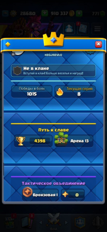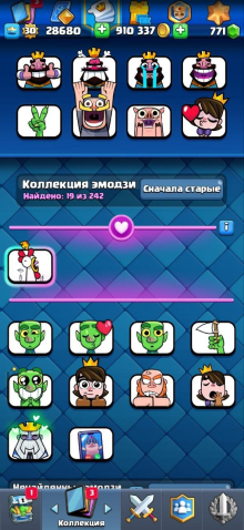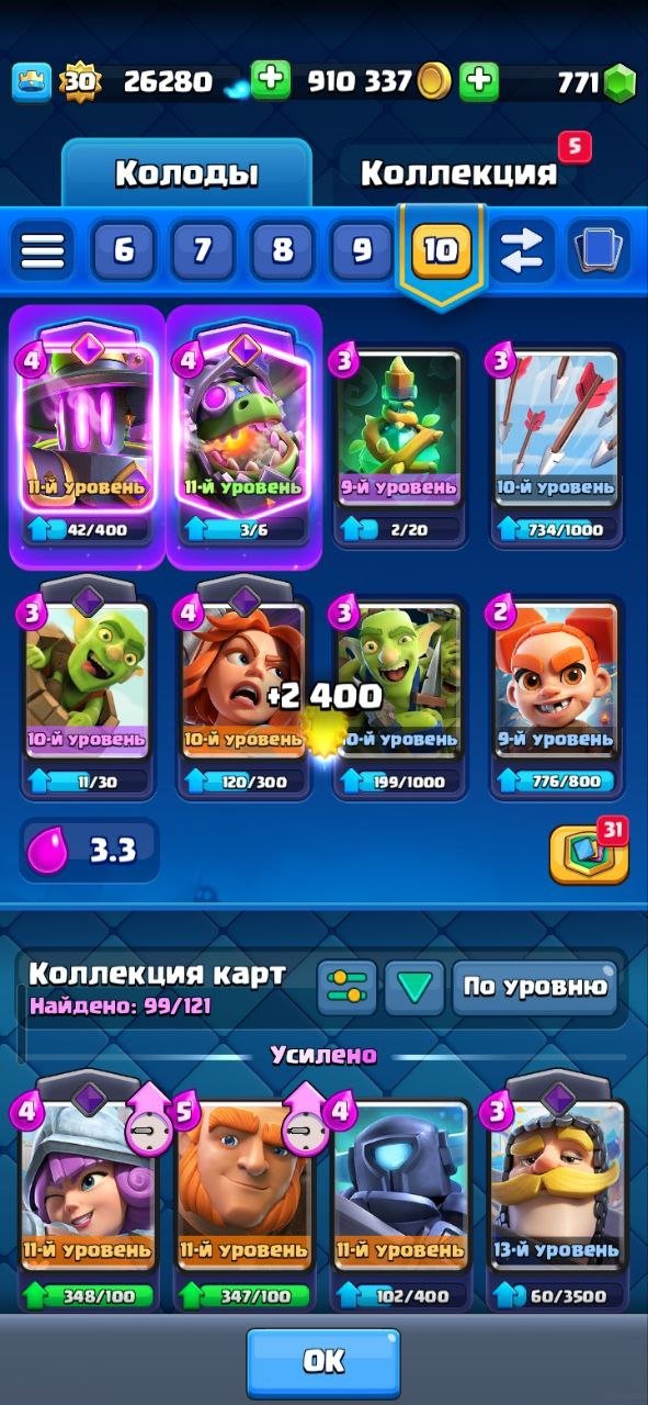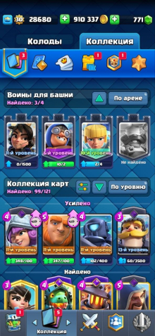 🔮На аккаунте 4400 кубков, 900 000 золота, 771 гемов, 30Уровень, 11ур башни ,19 эмодзи. 99 карт из 121