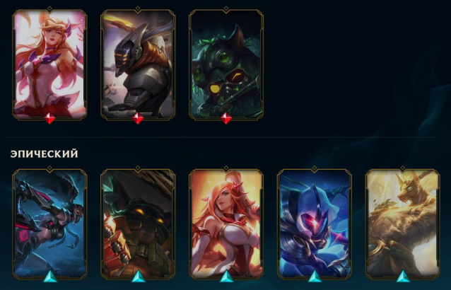 Эпические Скины: ПРОЕКТ: Джин, Космический клинок Мастер Йи, Супергалактический Физз, Физз из Бездны, Тристана из отряда ''Омега'', Звездная защитница Мисс Фортуна, ПРОЕКТ: Люциан, Вейгар из отряда ''Омега'', Орианна Темная Звезда, Акали, охотница за головами, Лунный страж Насус