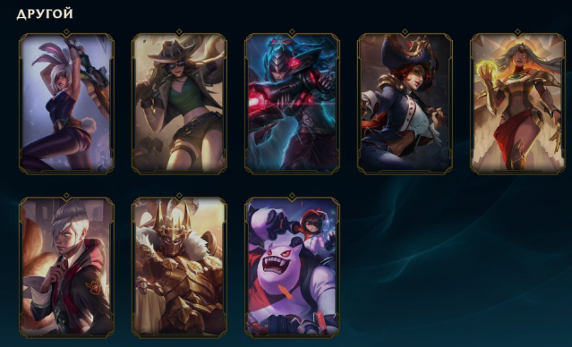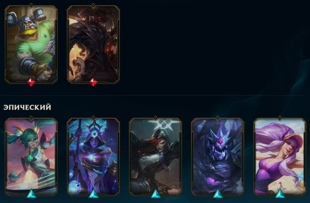 Эпические Скины: Тусовая Синдра, Сион Черная Стужа, Мисс Фортуна из расколотого ордена, Звездная защитница Сона, Космическая охотница Нидали