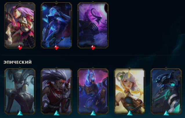 Эпические Скины: Программа Камилла, Космический ветер Анивия, Верховная ведьма Камилла, Диана Кровавая Луна, Супергалактический Гнар, Тусовая Кейтлин, Лунная императрица Люкс, iG Камилла