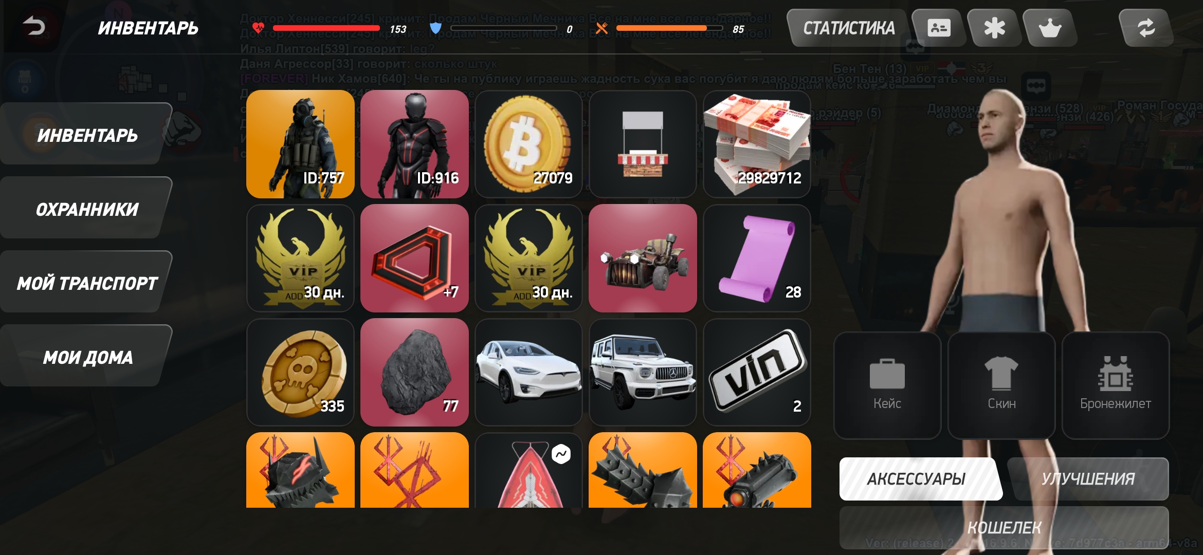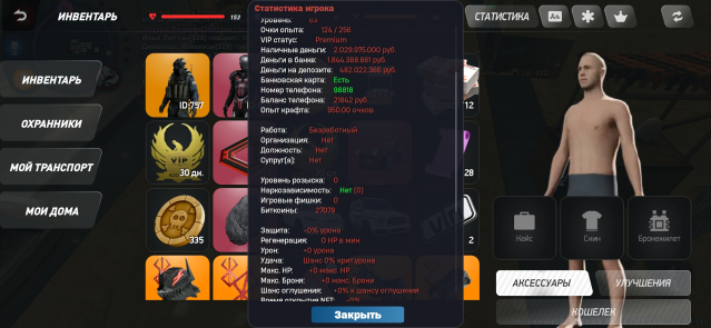 На аккаунте имеется 2ккк налички, 1.8ккк+ в банке, 480кк на депозите, 27к биткоинов в инвентаре.