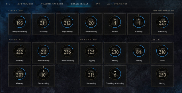 Weaponsmithing 183, Armoring 207, Engineering 212, Arcana 250, Cooking 250, Furnishing 226, Smelting 206, Woodworking 211, Leatherworking 216, Weaving 203, Stonecutting 250, Logging 124, Mining 217, Fishing 84, Harvesting 210, Skinning 250, Music 206, Riding 250