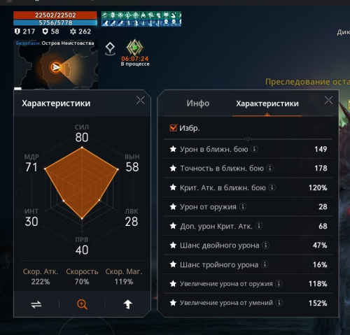 Статы: 216 деф, 59 снижение, 261 сопротивление умениям. Урон 155, точность 185, увеличение урона от умений 151%. Мардилы с лсом на 25% урона от оружия.
