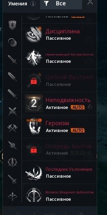 Фиол Скиллы: Проксима, Фокусировка +2 за адену, Красные Скиллы: Побег, Кувырок назад, Разум вампира, Дисциплина, Ограничивающий выстрел болтом, неподвижноть, героизм +2 за адену, Скиллы Наследника: Фиол — Ускорение Атаки, Стремление Побеждать