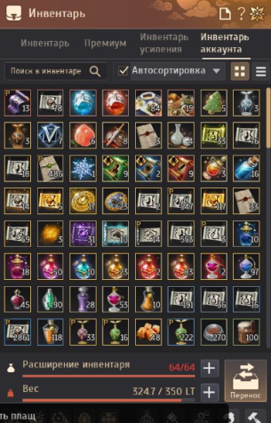 Расширен инвентарь аккаунта. Хорошая инкра, есть все ТОП релики (проапаны). Горичные 50 склад/20 аук. Петы 5/4 грейда (150 лт + песец с 5% дропа). Есть места под создание персов. 2800+ Свитков удачи. ВСЕ премы на 2+ месяца 🔥