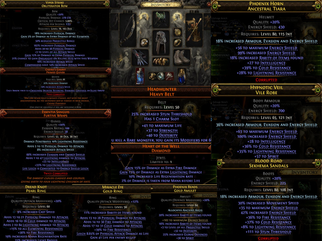 далее я оставлю ссылки, где вы можете посмотреть как выглядит зачистка самого убер контента на этом персонаже своими глазами, а так же ссылку на poe ninja, где можно самому посмотреть вещи на персонаже и взять код для Path of Building