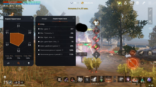 ℹ️ Другие Характеристики: Крит. Атк. 136%, Шанс Двойного Урона 68%, Увеличение Урона от Оружия 124%, Увеличение Урона от Умений 172%.