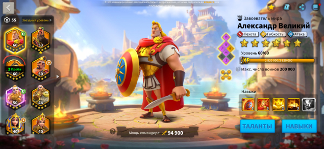 Подробное описание: много крутых командиров, хватает ресурсов живое королевство, отличный вариант, аккаунт заточен под пехоту