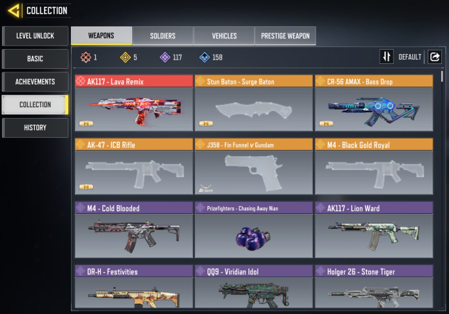 ◘ 🎯 Скины (на оружие): 1 мифических, 5 легендарных, 117 эпических, 158 редких