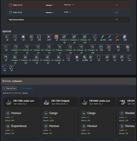 | Orcus (10laser dmg; 14hp +4speed; 13shield +4speed; 11penetration (+2)), Goliath+ (10ncp(+1); 6hp; 7shield; 12speed), Pusat+ (15hp; 10shield; 9speed(+1)), Solace+ (20dmgpvp OR 15ncp; 27hp; 9speed), Speahread+ (12laserdmg (+2); 5hp(+1); 18shield(+1); )