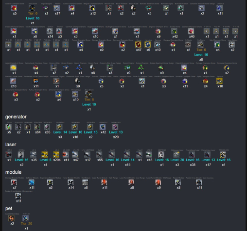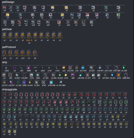| 3800 Diametrion, 1300 IAC, 2400 ABR, 980 I_Oil, 900k Rinusk, 166k Trace, 21k Aurus, 18k Schizm, 1700 Scrap, 10k Eternal frag