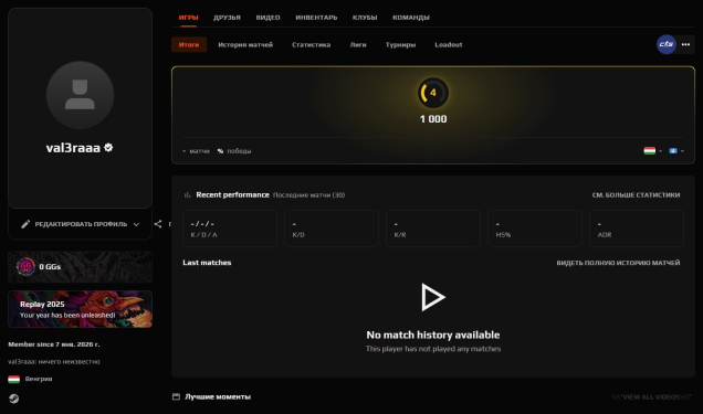 ⚡ FACEIT зарегистрирован, 4 lvl (1000 elo), premier в игре не открыт (нужно отыграть игры)