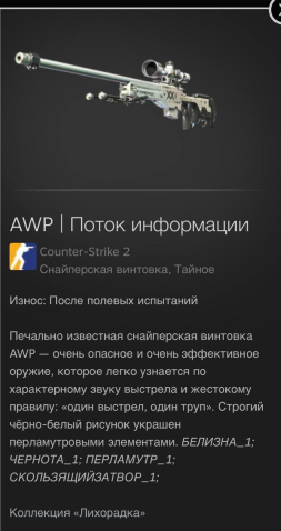 Краткое описание: 🏹AWP/Поток Информации🏹После Полевых Испытаний🏹Быстрая Доставка🏹Trade