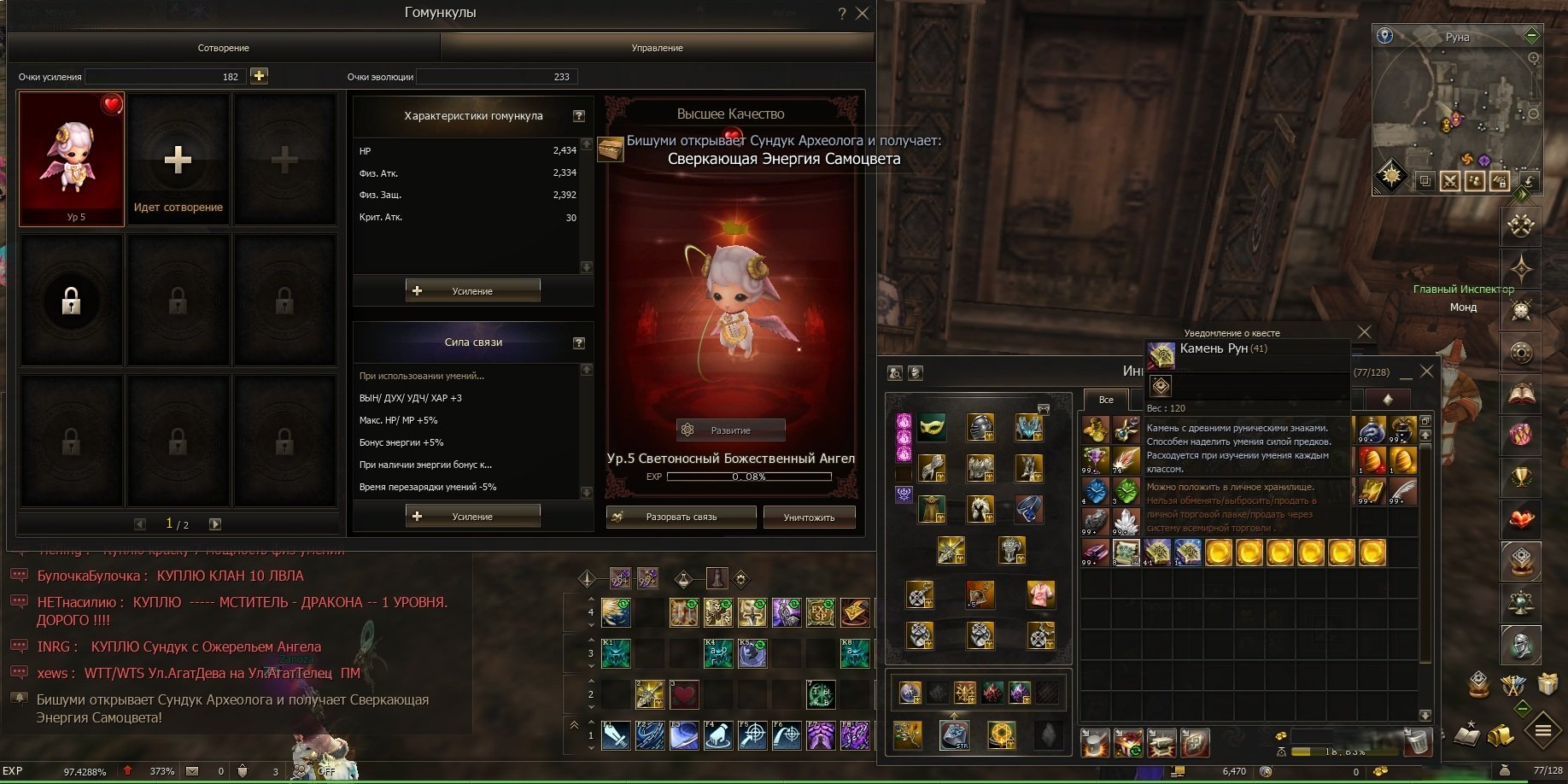 Описание: Рыцарь Ада- 110 -97%/Саб класс БД 109. Одет в Благ сет почета (1к рублей). В наличии Золотые сферы /камни рун-улучшенный камень рун /расходка.Легендарный гомункул .