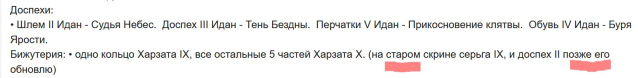 • Шлем II Идан — Судья Небес. Доспех III Идан — Тень Бездны. Перчатки V Идан — Прикосновение клятвы. Обувь IV Идан — Буря Ярости.